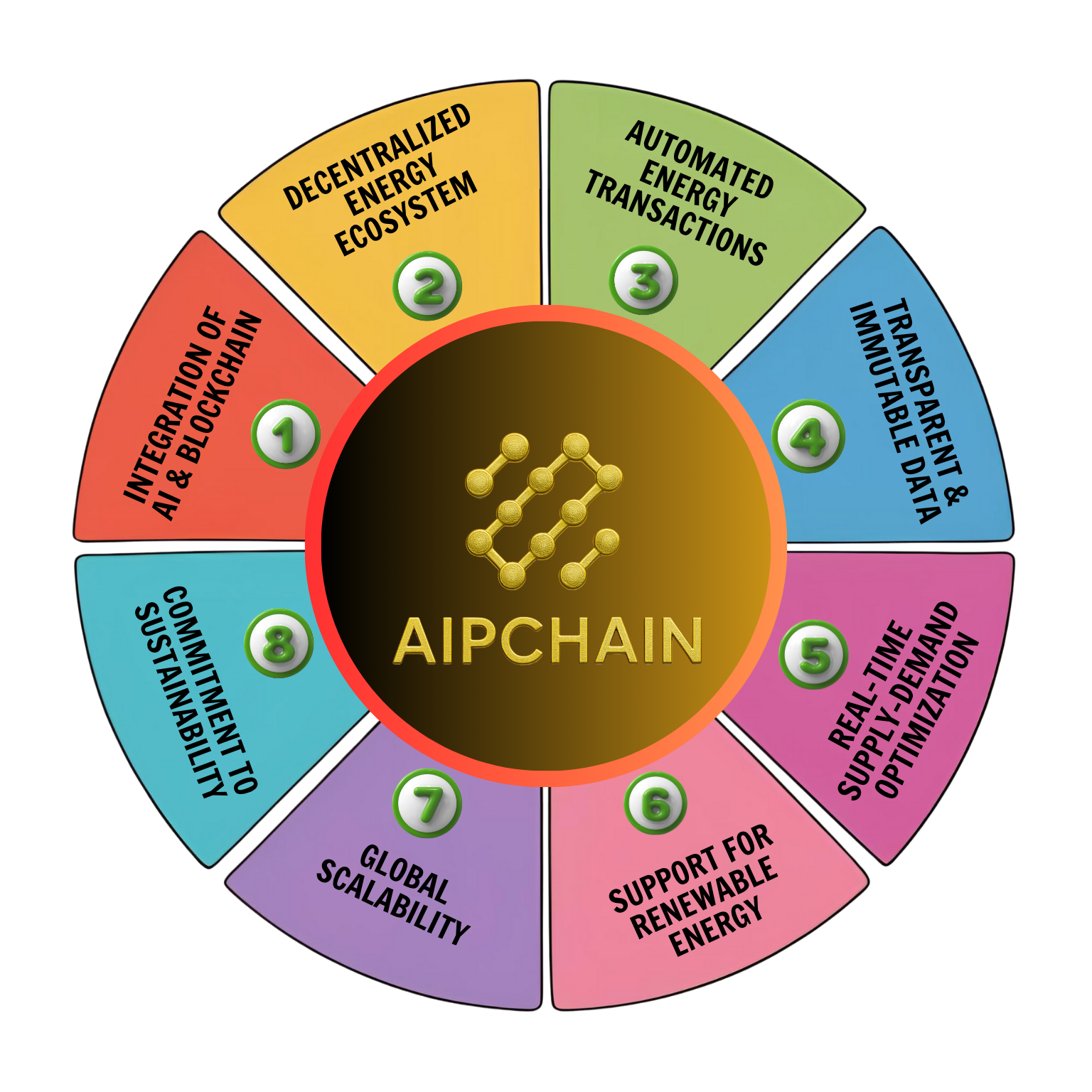 AIPCHAIN aspires to be the world’s leading decentralized energy ecosystem, revolutionizing energy markets with advanced AI that orchestrates transactions for optimal efficiency.